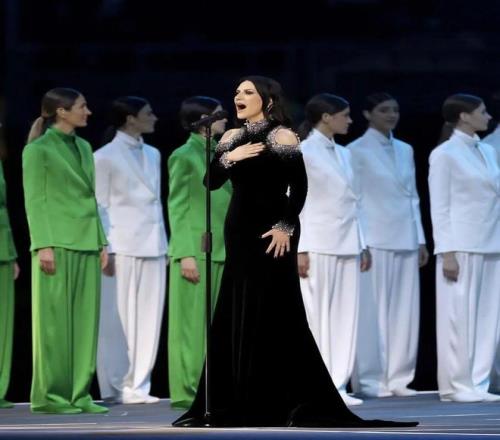奏唱意大利國歌《馬梅利之歌》時(shí),登臺(tái)的意大利女歌手Laura Pausini同樣身著Giorgio Armani Privé高級定制黑色禮服裙,展現(xiàn)浪漫迷人的意式風(fēng)情和品牌始終不變的優(yōu)雅格調(diào)。